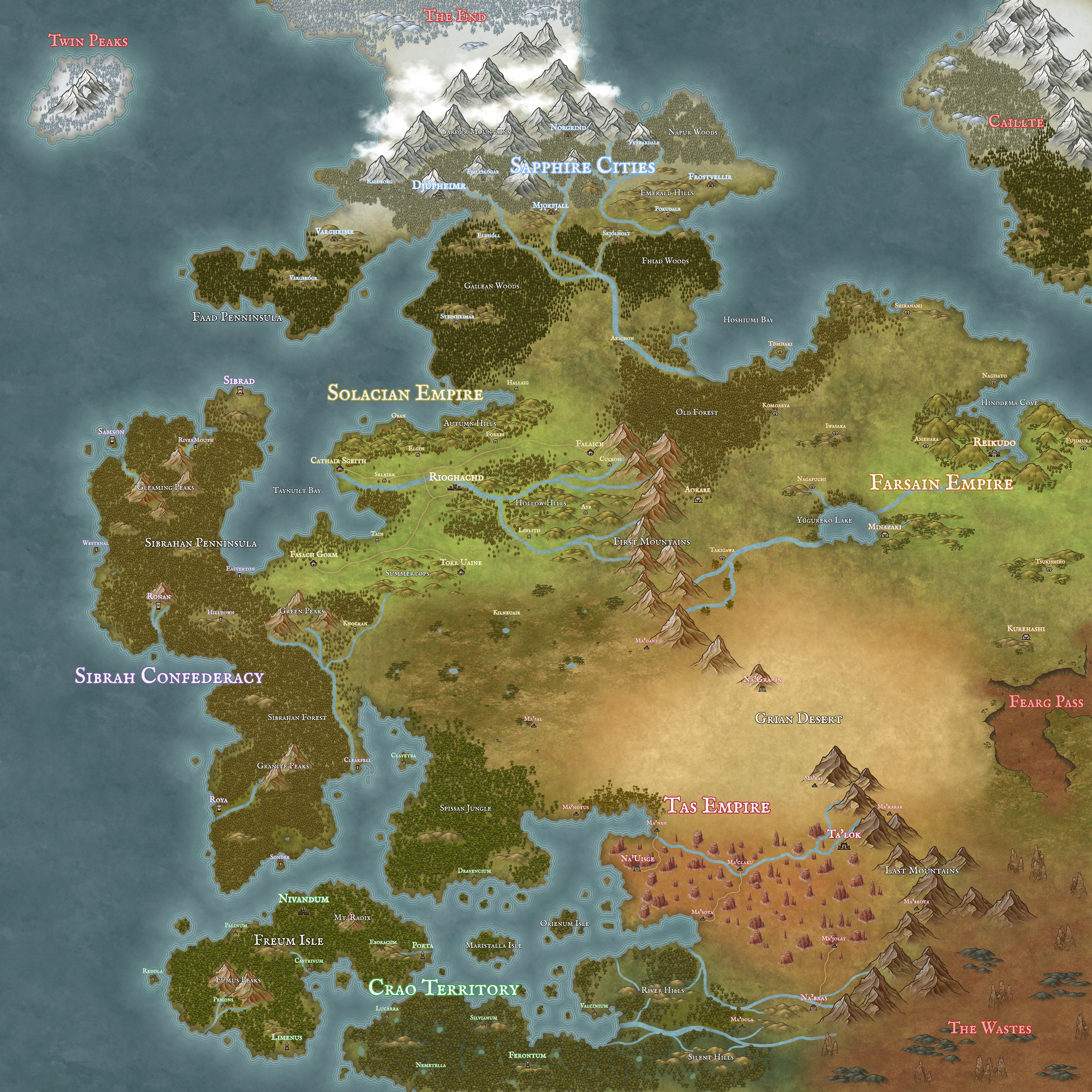 The continent is divided into six (6) empires, with as much or more unclaimed wilderness between them. Five of these are predominantly home to a single species, whereas the Sibrah Confederacy is a true melting pot of species and cultures. Learn more about the empires of Tirvale.